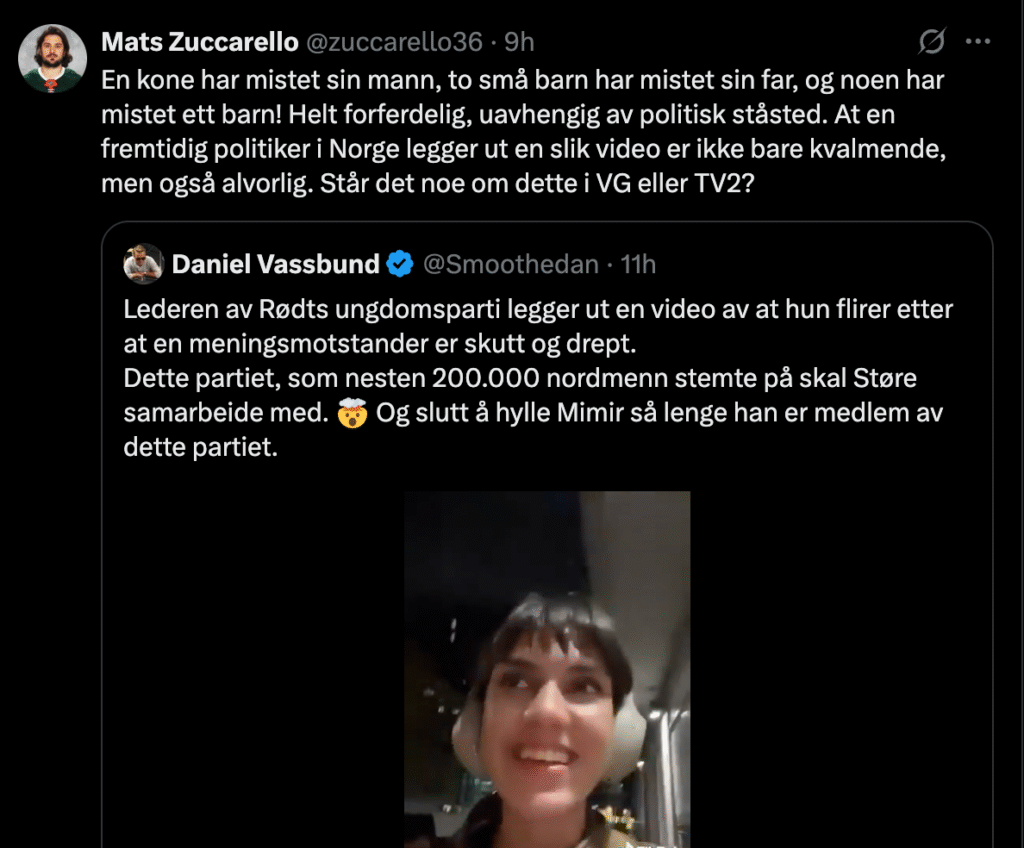 Hokeista Mats Zuccarello dodał na X: „Żona straciła męża, dwoje małych dzieci straciło ojca, a niektórzy stracili dziecko! To absolutnie przerażające, niezależnie od poglądów politycznych. Fakt, że przyszły polityk w Norwegii publikuje taki film, jest nie tylko obrzydliwy, ale też poważny. Czy jest o tym coś w VG lub TV2?”